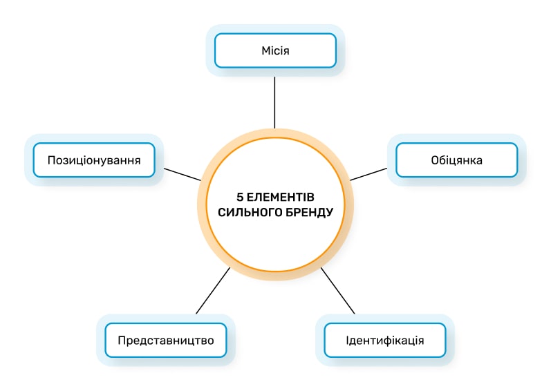 5 елементів сильного бренду: Місія, Обіцянка, Ідентифікація, Представники, Позиціонування